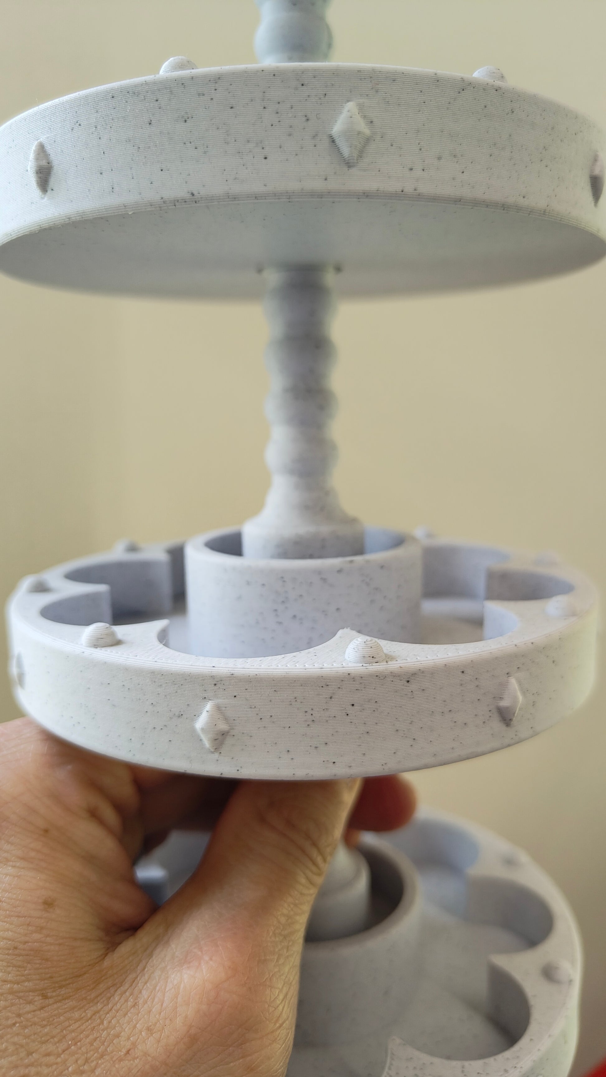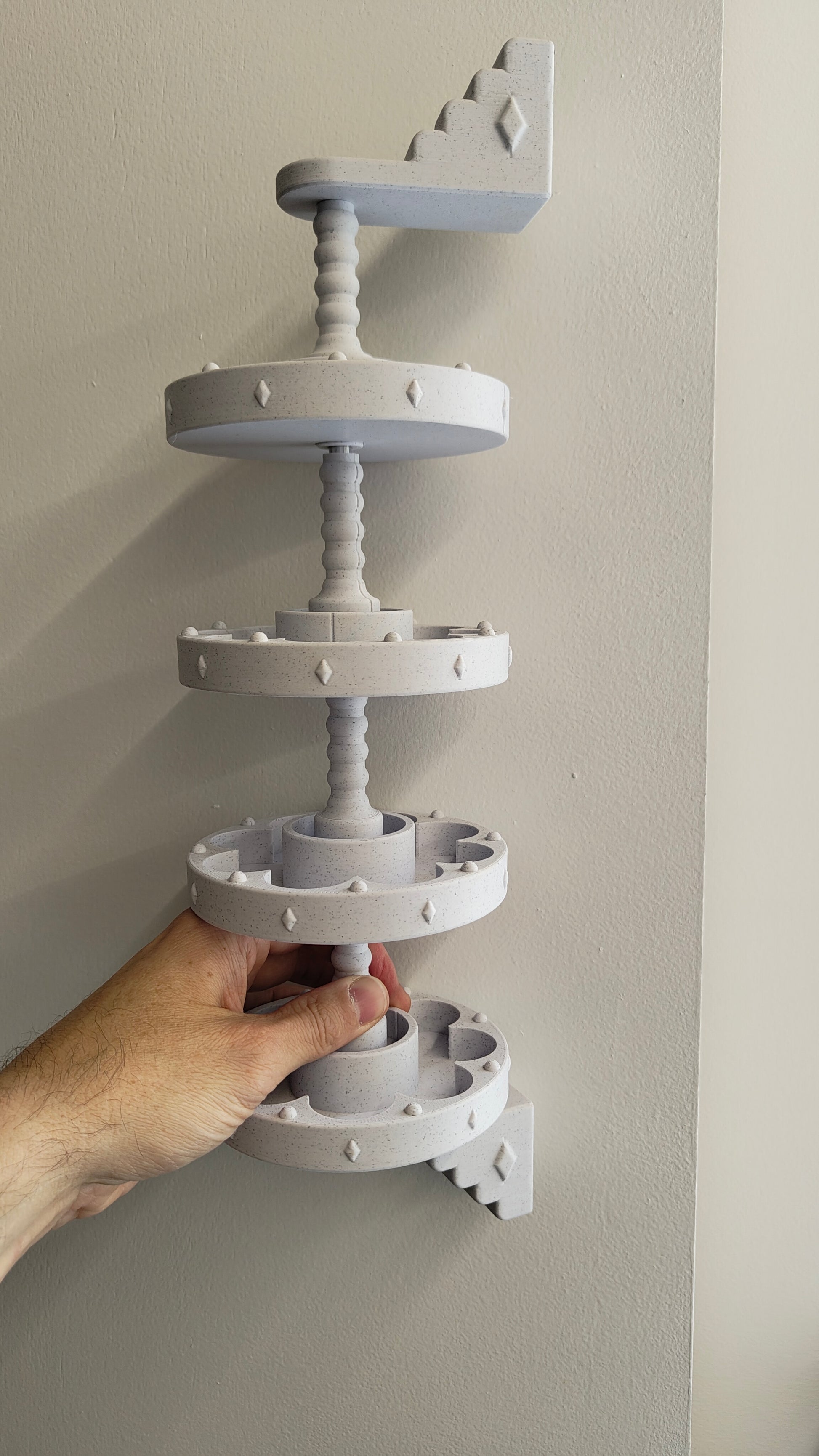 Beautiful and functional carousels for your essential oils. Several designs available upon request. We have a basic white with no cutouts(flat tray with no separators for each bottle), and a fancier one with separators for bottles in each platter. They all spin freely. The white uses adjustable ball bearing stop collars. The marble colored piece uses custom plastic bushings. All platters are removable and height adjustable. Mounts to your wall with two screws. Mount bottom bracket first then insert assembly and fasten top bracket last. Platters and mounts are made from plastic and shaft is stainless steel. Made to order and may take several days to ship. Please be patient. Additional photos or video available upon request.