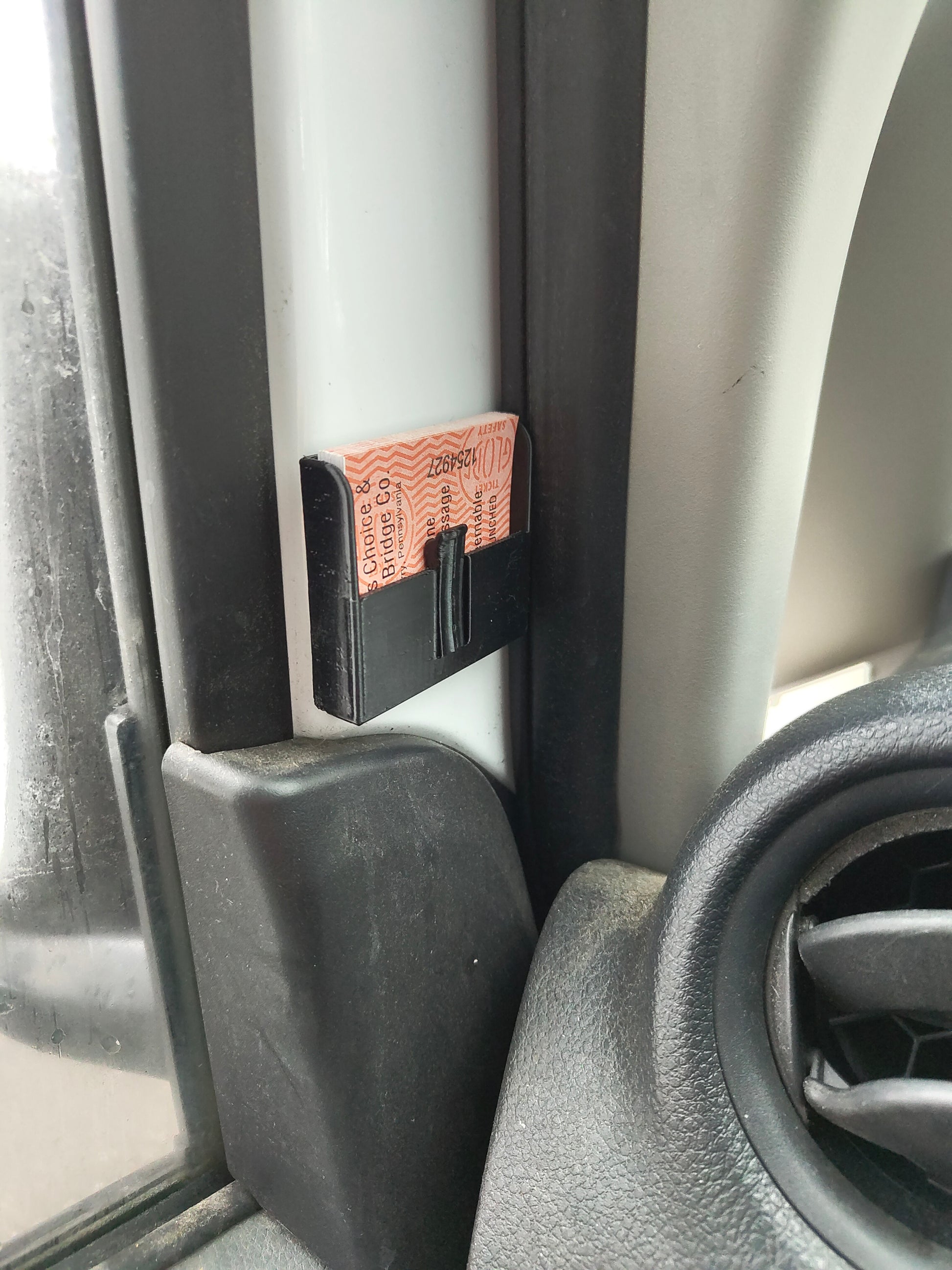 If you traverse the Delaware Water Gap and frequent the Dingman's Ferry Bridge you know about the ticket books. Tearing them off while driving is annoying. Tear them all off in one shot and put them in this little pouch you can stick to your dash. Holds them snug and allows you to see at all times when you are running low. Comes in black or white flexible plastic and is extremely tough. Holds one whole book. Double stick tape comes pre-applied. Make sure your chosen surface is clean and free of armor-all or similar oils. Heat up the pad first for the best results.