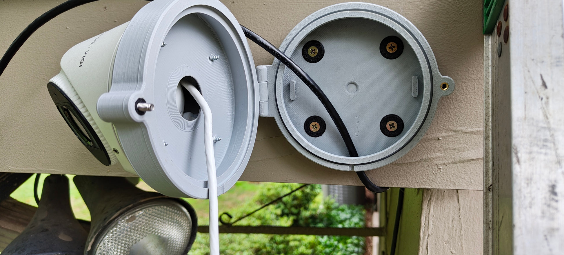 A universal camera enclosure designed to work with most cameras. This unique design not only works with any camera but has a built-in hinge so when you are servicing the connection inside you have no need for re-mounting and re-aiming the camera. One screw holds the enclosure shut. This box is roughly 4.75 inches OD and 4.5 inches ID. It also includes two built-in cable-tie mounts to secure your cabling inside the box. There are four pre-drilled mounting holes and one recessed cable entry point sealed and ready to be drilled out when needed. Place your cctv camera on the front lid and mark your mounting holes. Then pre-drill them and insert your own screws. NOTE: Box must be mounted with drain hole facing down and hinge on the left. This box does not need a gasket as it has specially designed rain gutters in it. Your connection at the camera should be designed and terminated with the IP67 rated connections. No rain will get inside the box.